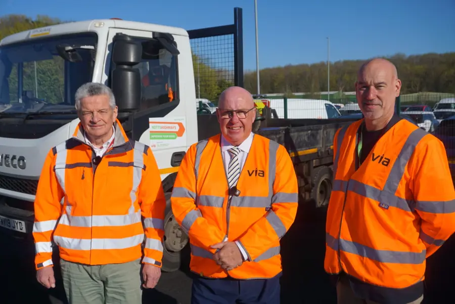Council leader, Councillor Mick Barton; Councillor Bert Bingham, Cabinet Member for Transport and Environment and Councillor John Semens, Deputy Cabinet Member for Transport and Environment, visited the Via East Midlands’ Bilsthorpe Depot on Tuesday morning to give the teams a send-off.